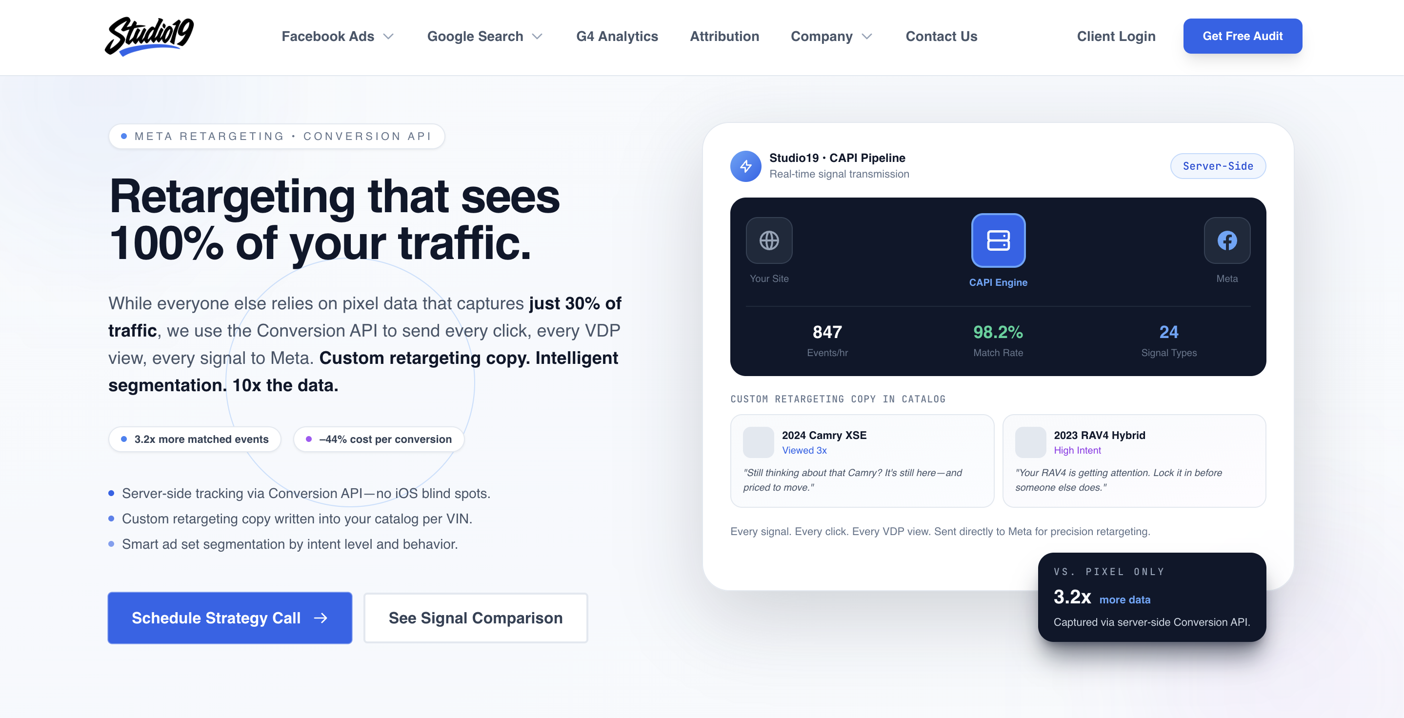 While everyone else relies on pixel data that captures just 30% of traffic, we use the Conversion API to send every click, every VDP view, every signal to Meta. Custom retargeting copy. Intelligent segmentation. 10x the data.