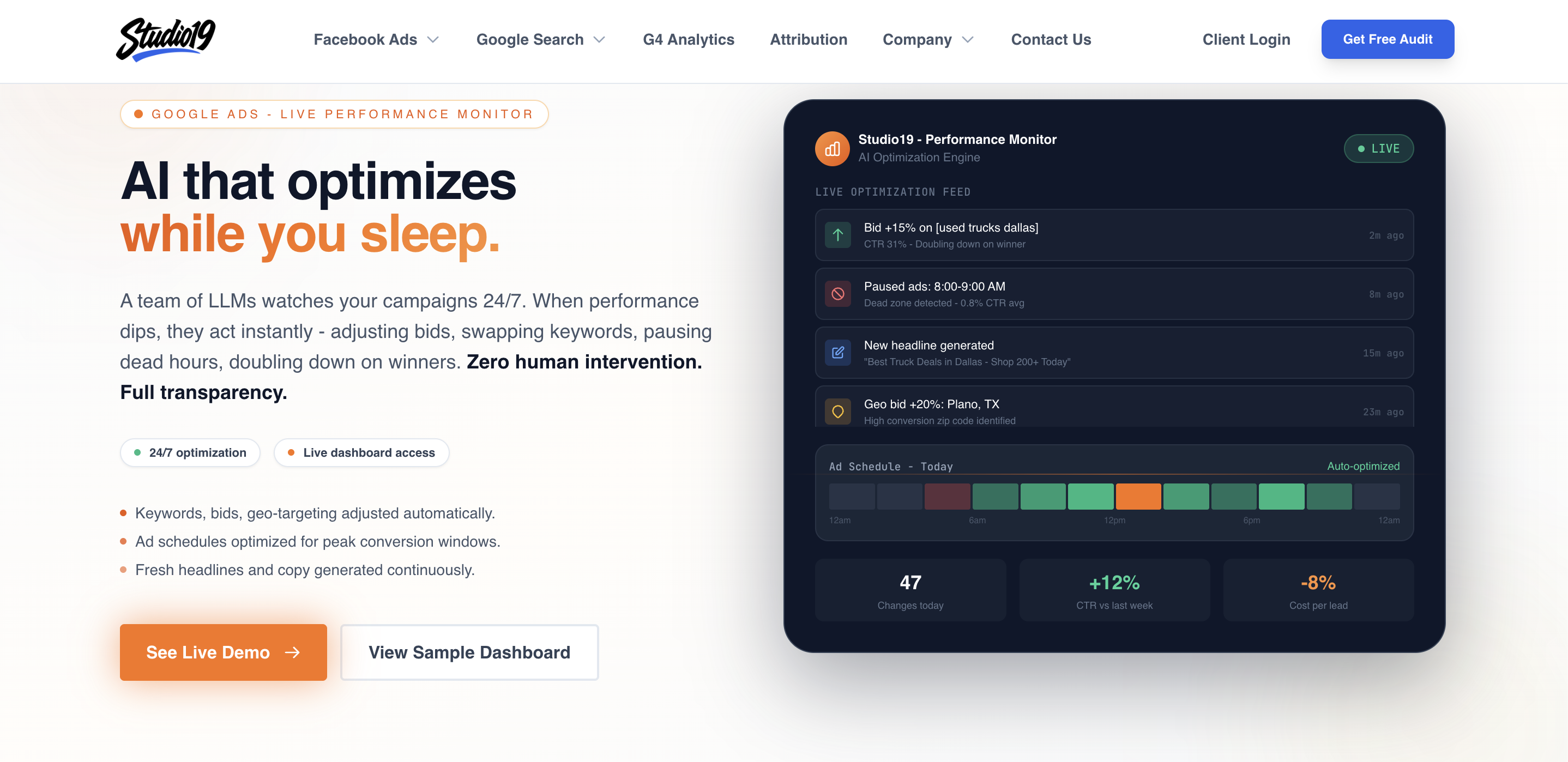 A team of LLMs watches your campaigns 24/7. When performance dips, they act instantly - adjusting bids, swapping keywords, pausing dead hours, doubling down on winners. Zero human intervention. Full transparency.